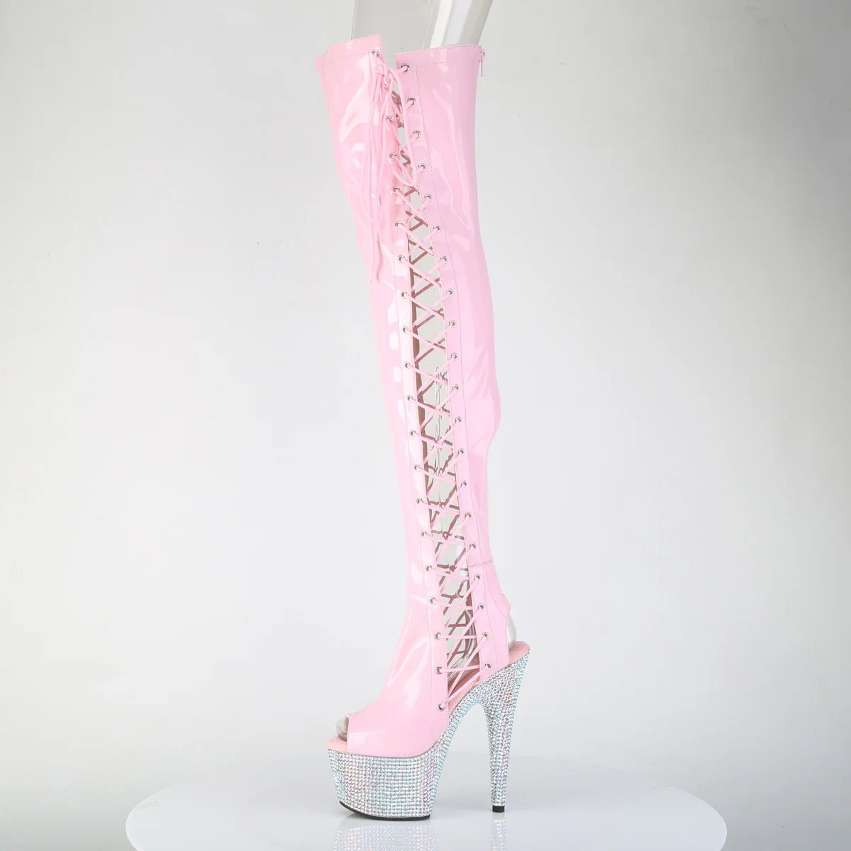 7" (178mm) Heel, 2 3/4" (70mm) Platform Open Toe/Back Inner & Outer Side Lace Up Thigh High Boot Featuring Silver AB Rhinestones Covering the Entire Platform Bottom, Full Length Back Zip Closure