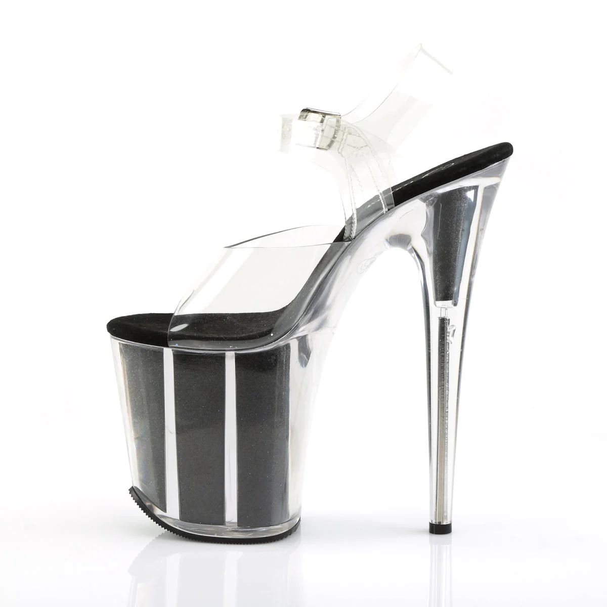 Step into the spotlight with the Flamingo-808G, a striking ankle strap sandal that embodies both glamour and height. Featuring an impressive 8-inch heel and a dazzling 4-inch platform with glitter inserts, these sandals are designed to catch the light and eyes in any room. The elegant clear and black design adds a touch of sophistication, making these shoes perfect for those who love to stand out. Ideal for special occasions or nights out, the Flamingo-808G will complement any ensemble with a luxurious flair.