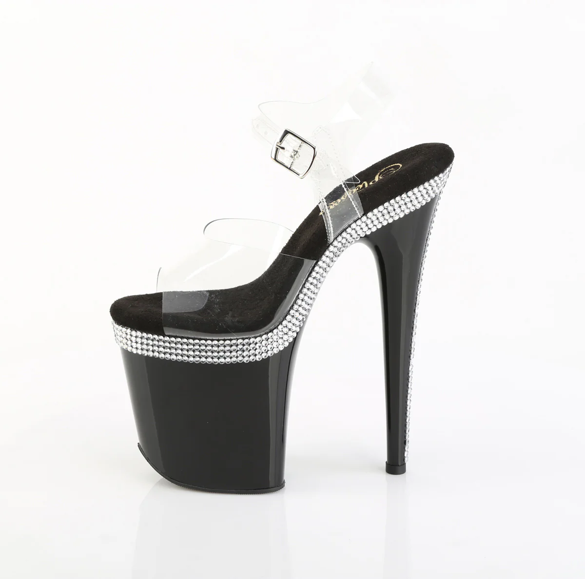 8" (100mm) Heel, 4" (200mm) Platform Ankle Strap Sandal Featuring Multiple Rows of Rhinestones on the Platform Top Edge and Heel