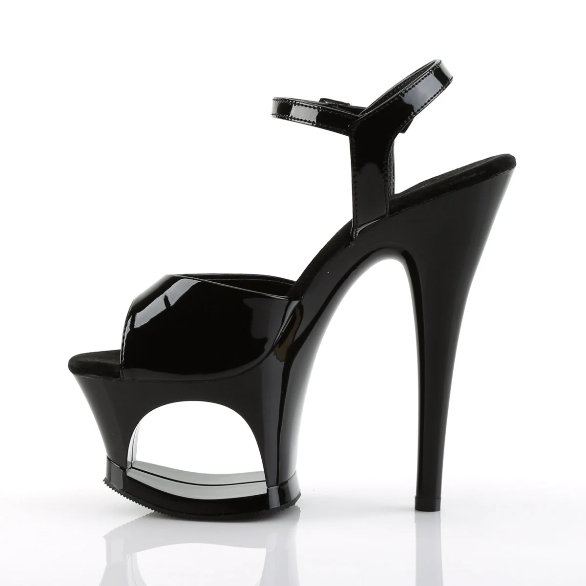 Elevate your presence with the Moon-709 Ankle Strap Sandals, featuring an impressive 7-inch heel complemented by a 2 3/4-inch cut-out platform. These sandals, showcasing a bold black tone, add a dramatic twist with their unique platform design. The ankle strap brings a stylish contour to any ensemble, ideal for special occasions or glitzy nights out.