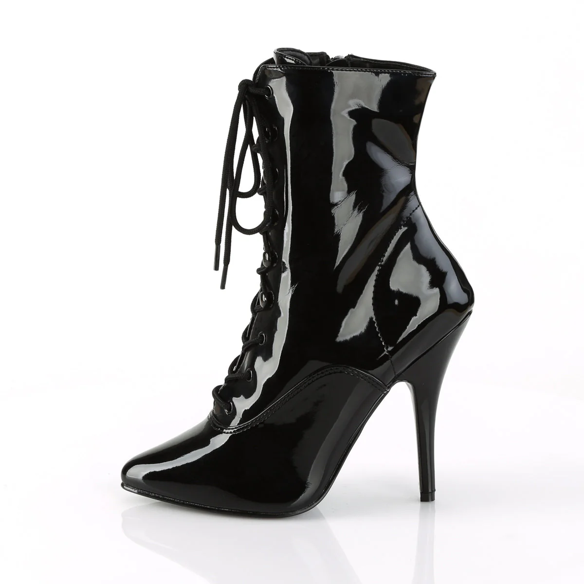 Discover your daring side with the Seduce-1020 Lace Up Ankle Boots. Featuring a sleek 5-inch heel and a dramatic lace-up front, these boots are crafted for those who love to stand out. The full inner side zipper offers a practical touch, making them easy to slip on and off. Complete your edgy ensemble with these bold, black boots that complement any adventurous spirit.